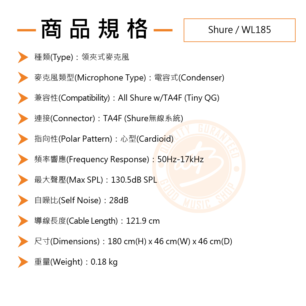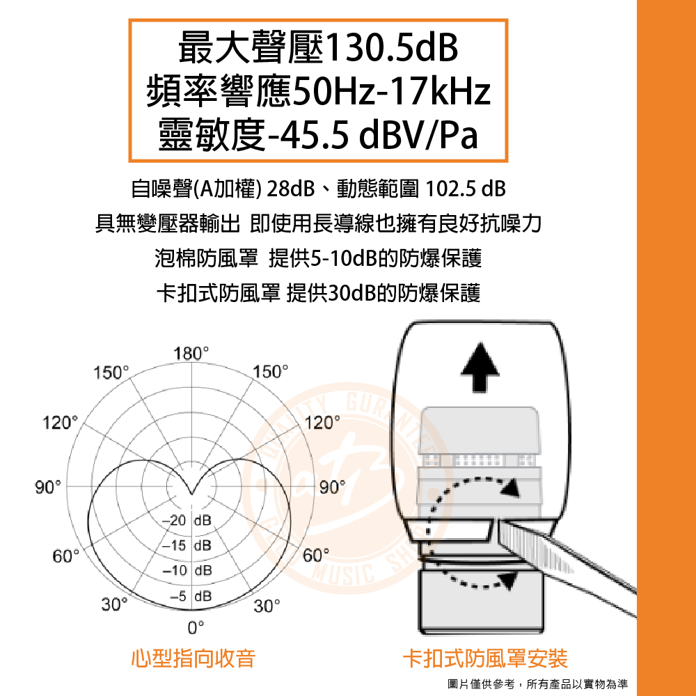 ◆ 最大聲壓130.5dB、頻率響應50Hz-17kHz、靈敏度-45.5 dBV/Pa