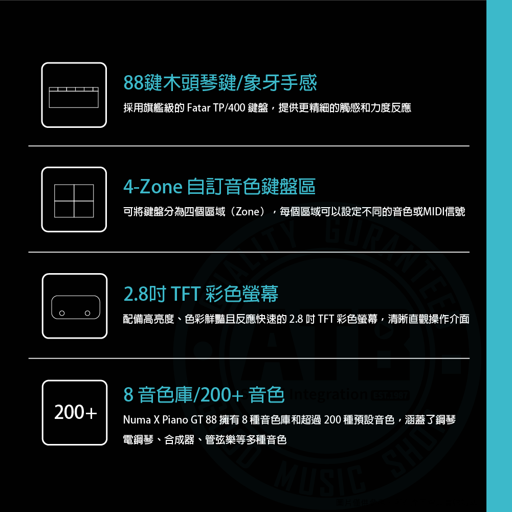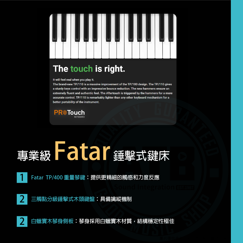◆採旗艦Fatar TP/400錘擊式重量木頭琴鍵,含Aftertouch與擒縱機制