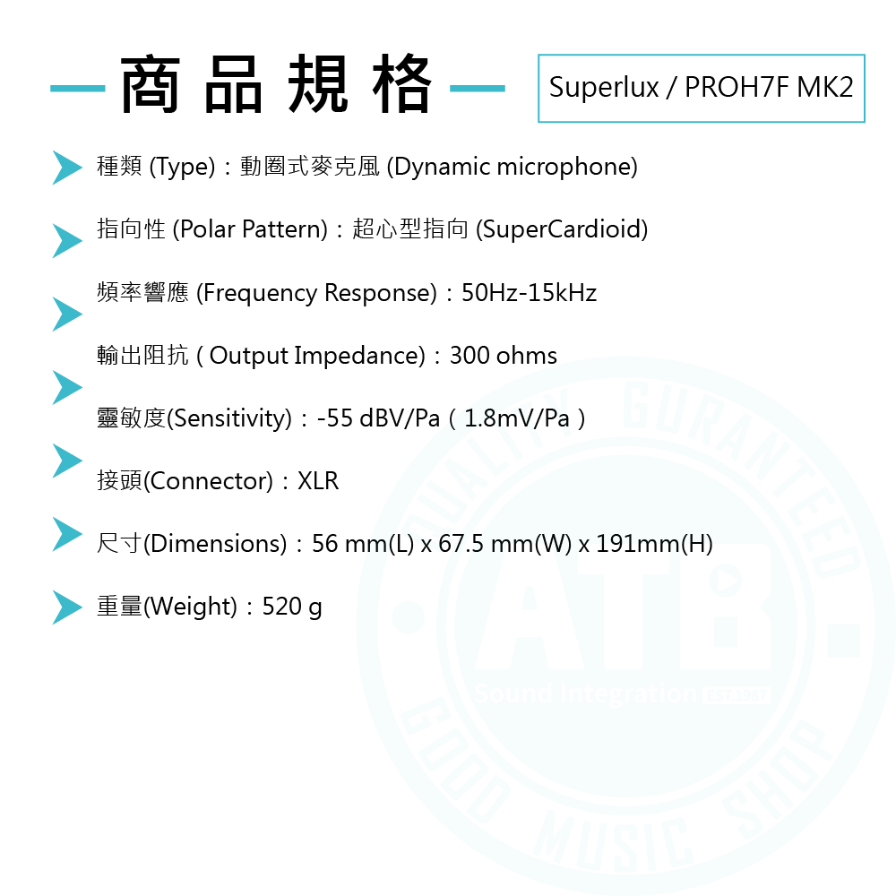 ◆ 最大聲壓 94dB、頻率響應50Hz-15kHz、靈敏度-55 dBV/Pa