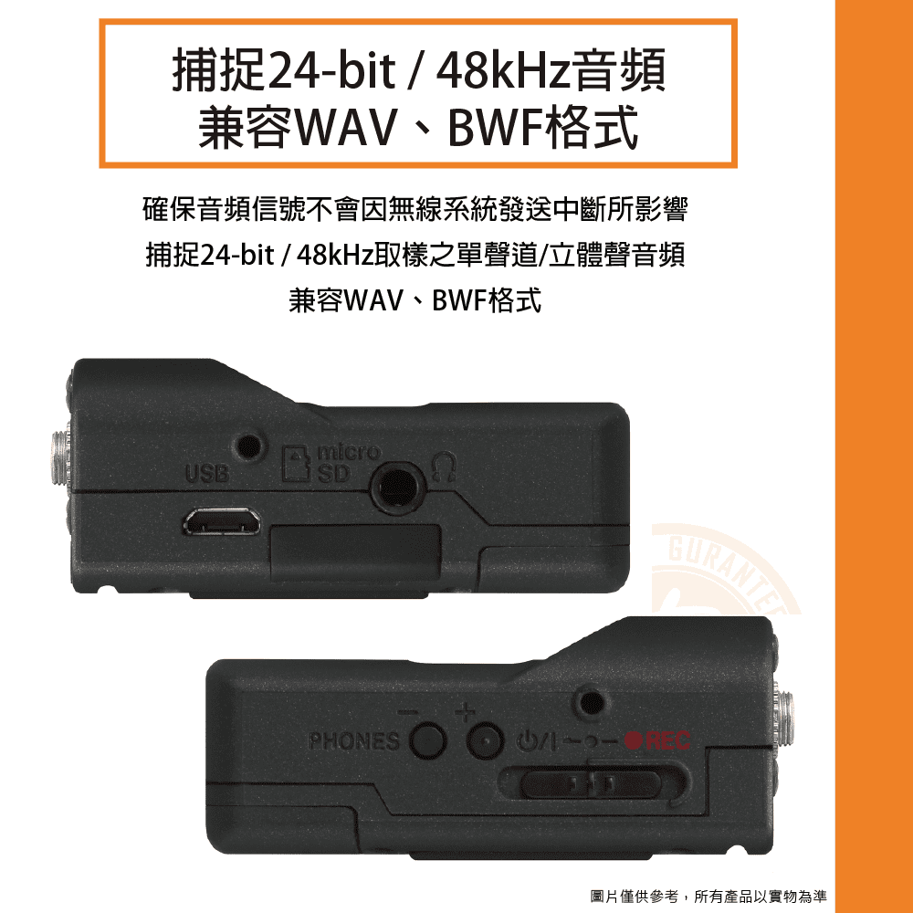 ◆ 連接於無線麥克風與發射器之間作為備份錄音機,兼容microSD(64G)/SDHC卡(32G)