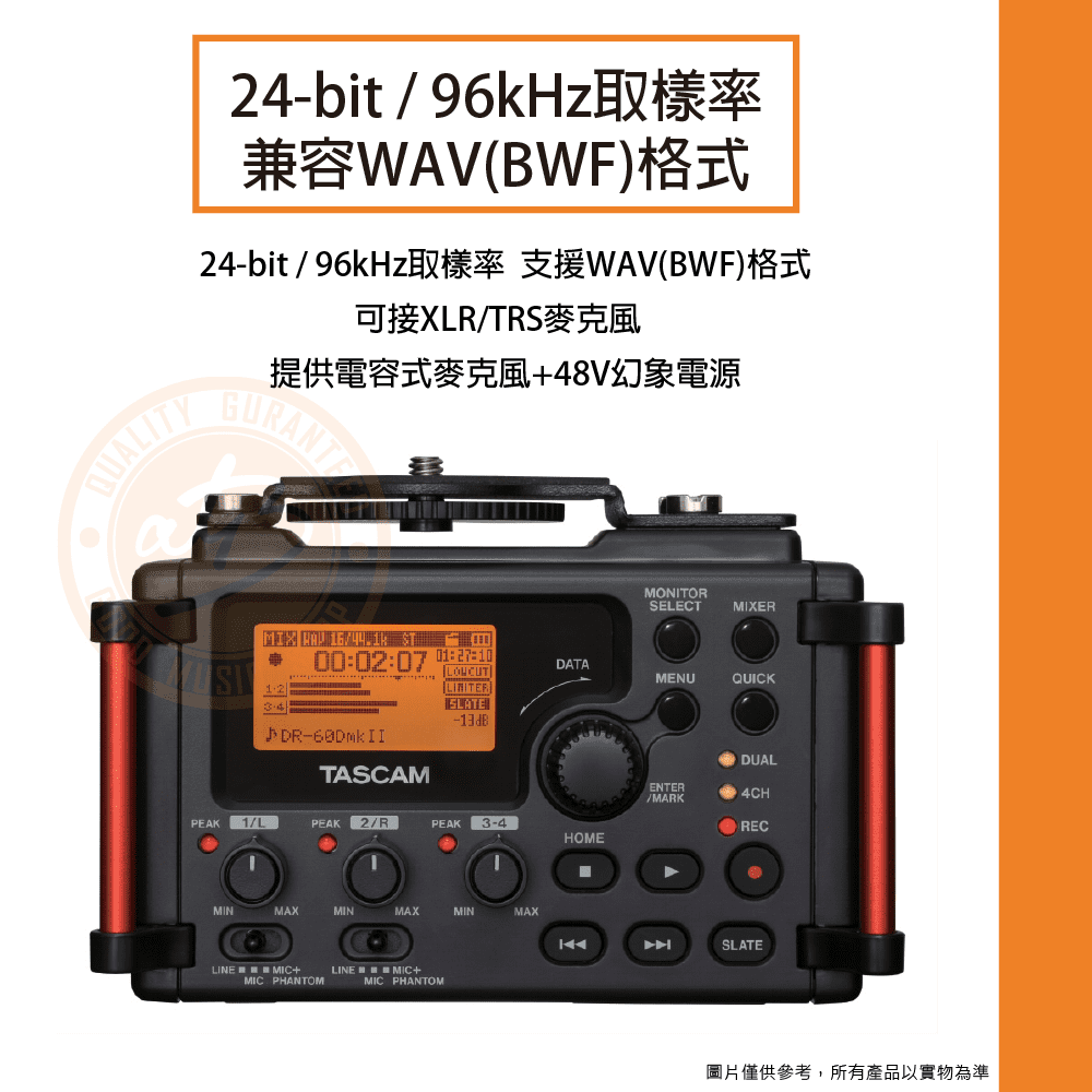 ◆ 24-bit / 96kHz取樣率,支援WAV(BWF)格式,可接XLR/TRS麥克風