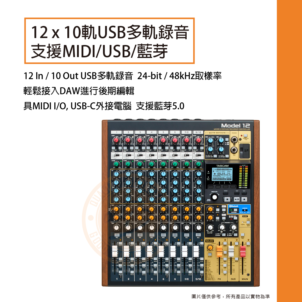 ◆ 12 In / 10 Out USB多軌錄音,具MIDI I/O, USB-C外接電腦,支援藍芽5.0