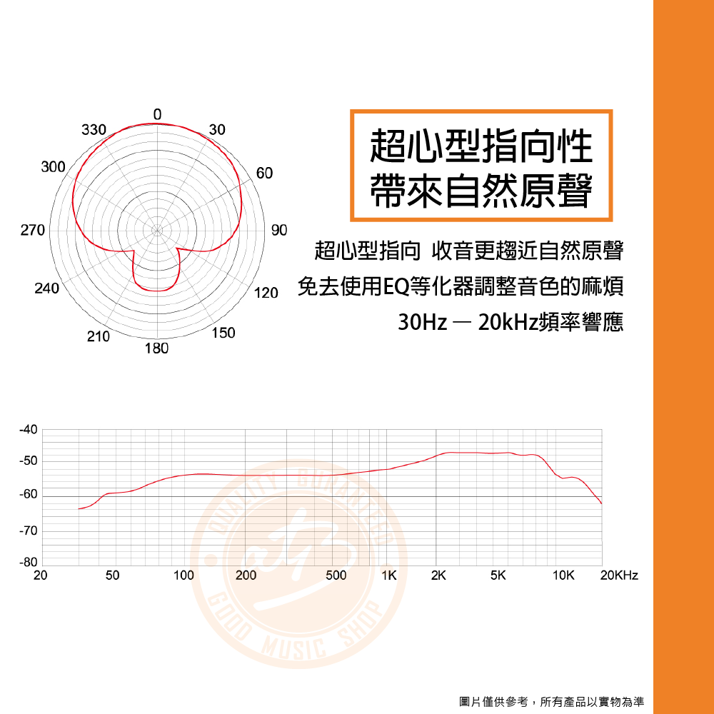 ◆ 超心型指向,收音更趨近自然的原聲,30Hz – 20kHz頻率響應