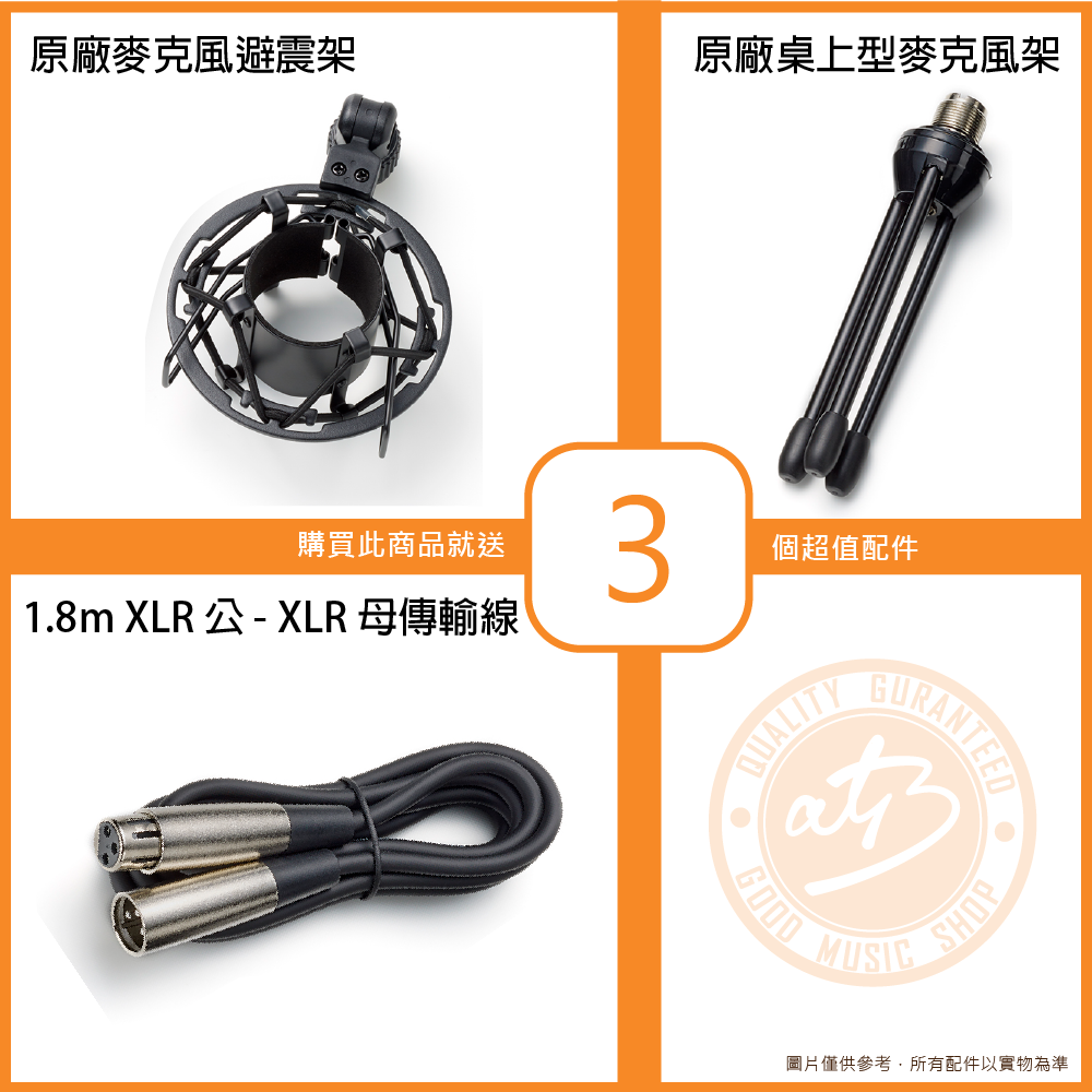 ◆ 附件含避震架、桌上型麥克風架、1.8m XLR麥克風導線