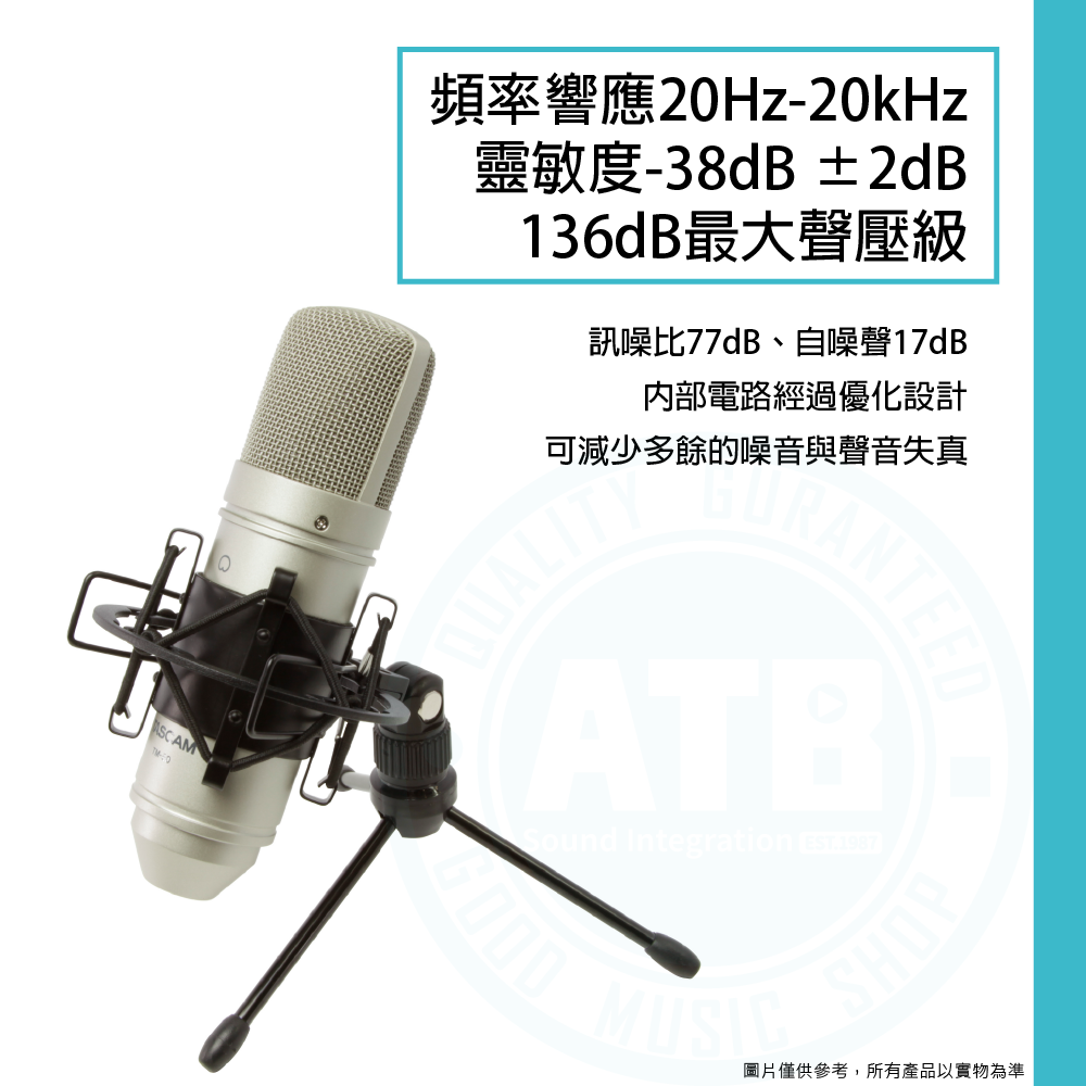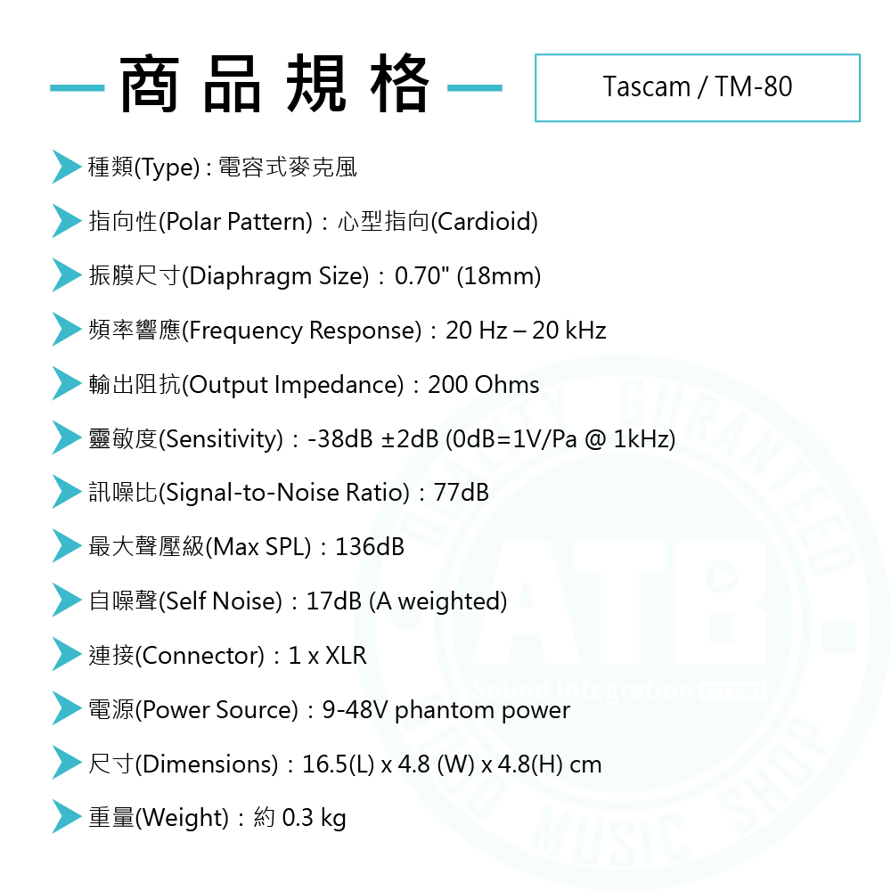 ◆ 頻率響應20Hz-20kHz、靈敏度-38dB ±2dB、136dB最大聲壓級