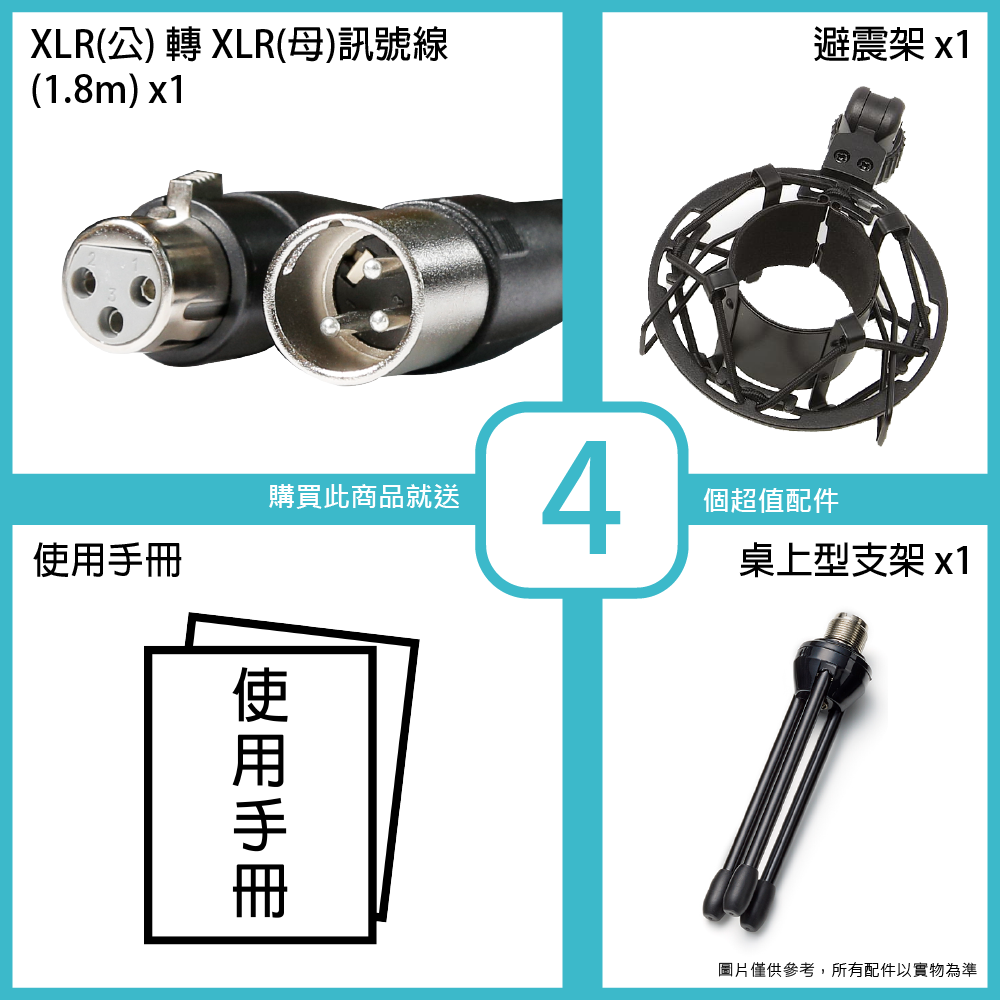 ◆ 附贈原廠避震架、桌上型支架、XLR導線(1.8m)