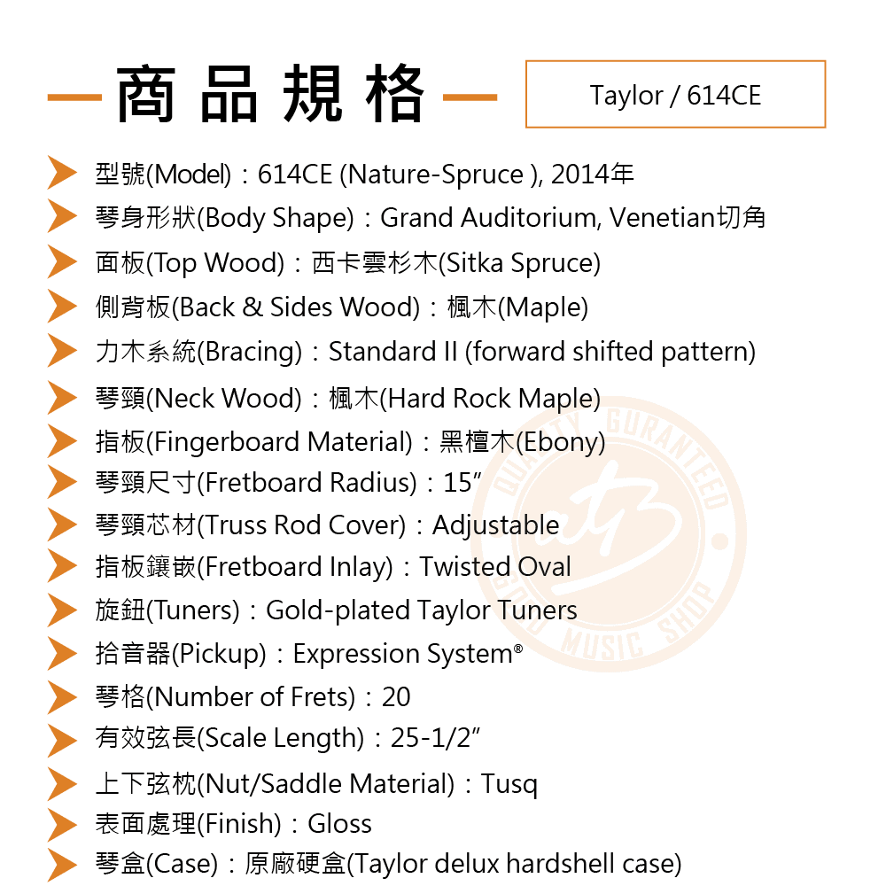 ◆ 西卡雲杉木面板 楓木側背板、楓木琴頸與黑檀木指板