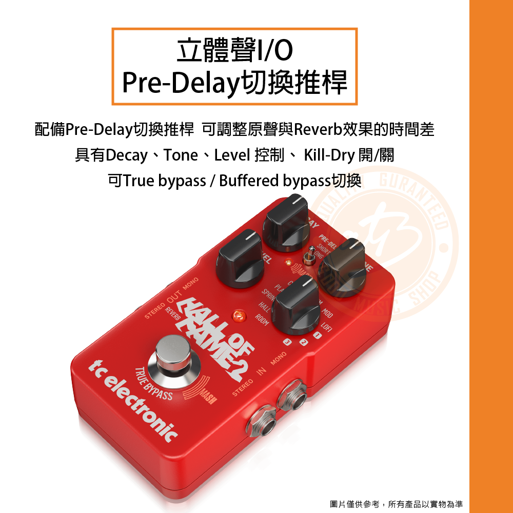 ◆ 立體聲I/O,具Pre-Delay切換推桿、True bypass / Buffered bypass切換