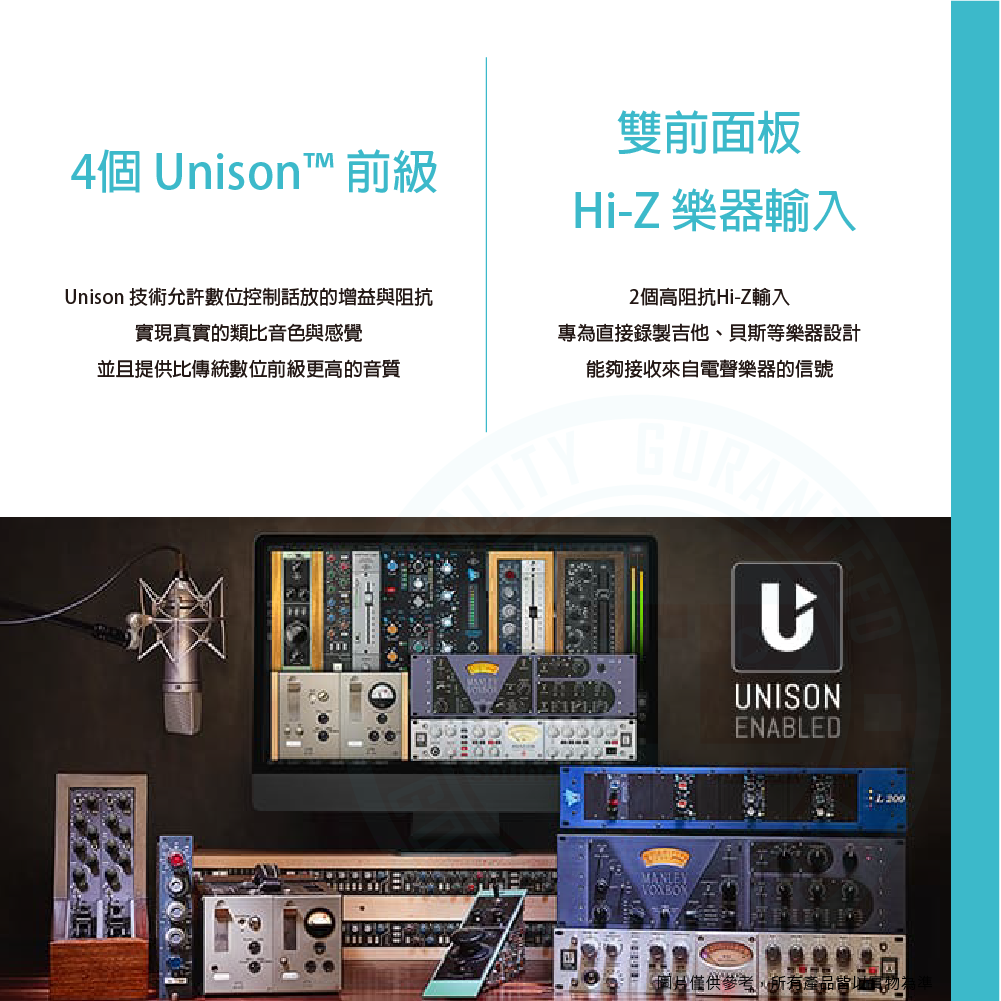 ◆四個 Unison™ 麥克風前置放大器,具備 Hi-Z 樂器輸入和多種連接選項
