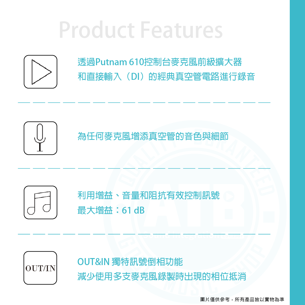◆ 搭載Bill Putnam設計的傳奇610電子管,提供復古溫暖的音色