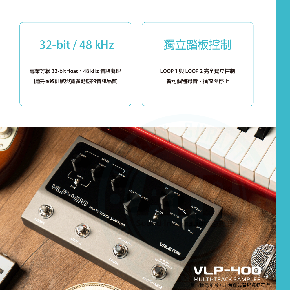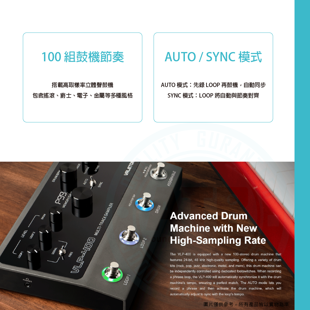 ◆ 內建 100 組鼓機節奏樣式,支援 AUTO 與 SYNC 模式
