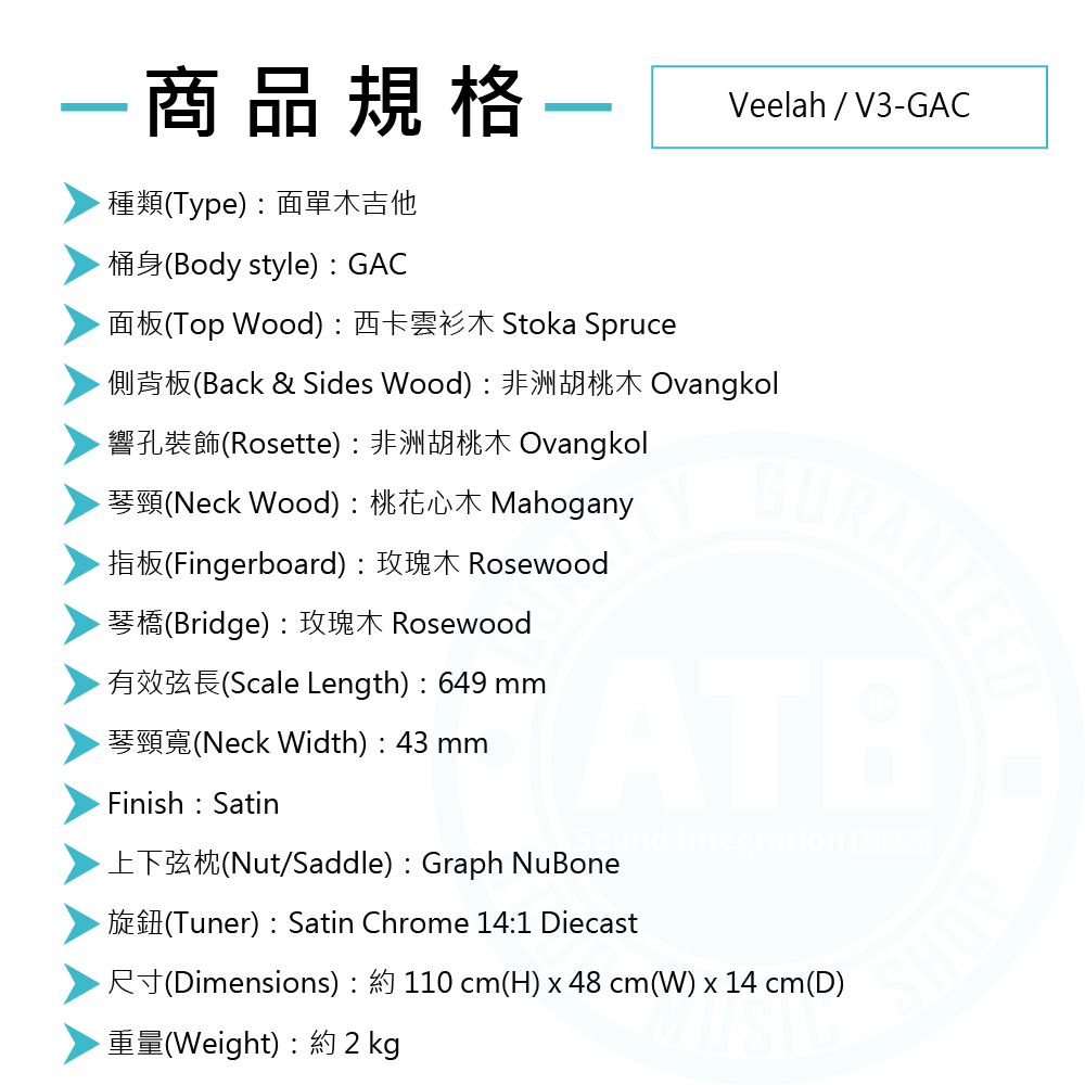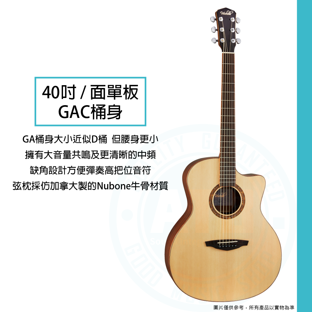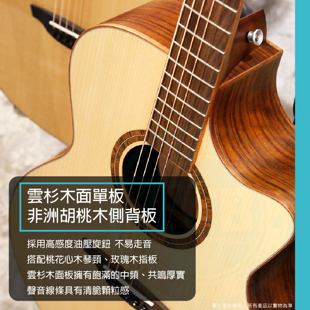 ◆ 採雲杉木面單板、非洲胡桃木側背板、玫瑰木指板,共鳴厚實具顆粒感