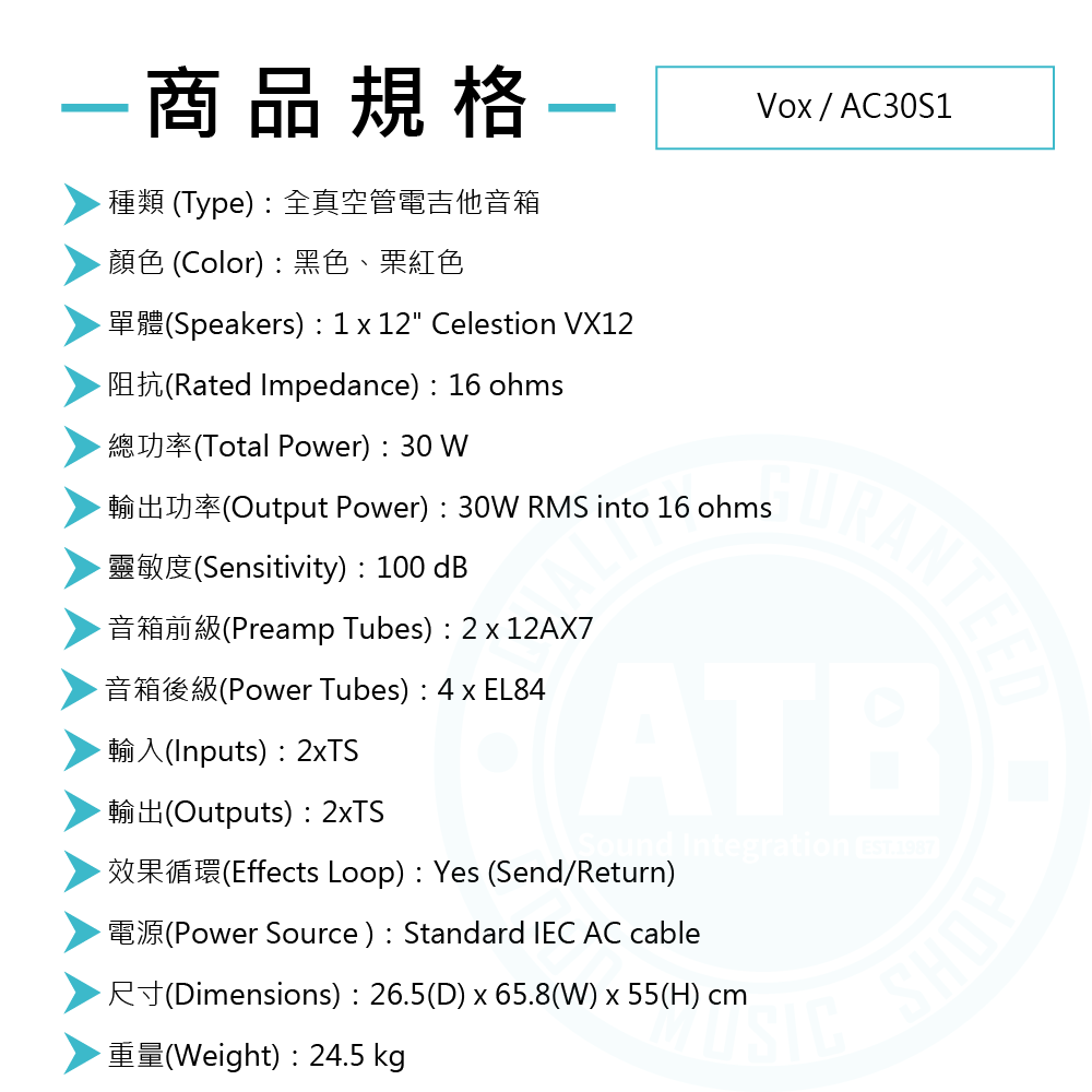 ◆30W全真空管電吉他音箱,搭載12吋Celestion VX12單體