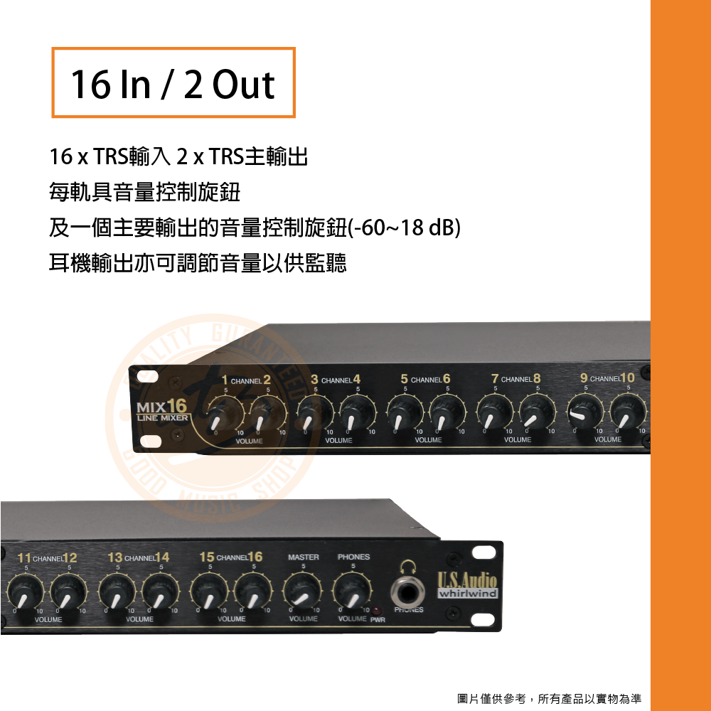 ◆ 16 x TRS單聲道輸入、2 x TRS單聲道輸出,每軌具音量控制旋鈕及一個主要輸出的音量控制旋鈕,耳機輸出亦可調節音量以供監聽