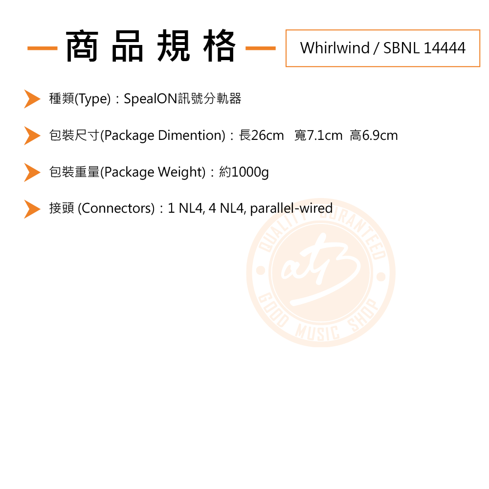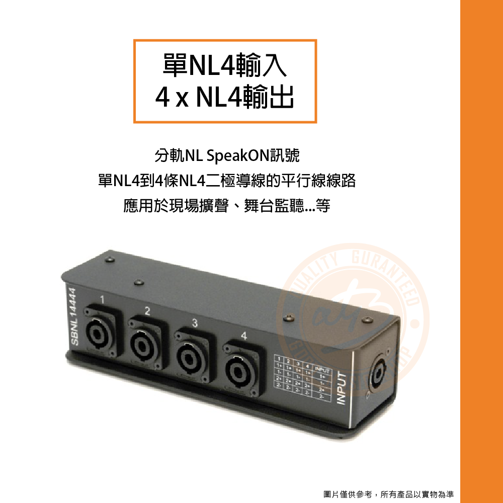 ◆ 分軌NL SpeakON訊號,單NL4到4條NL4二極導線的平行線線路