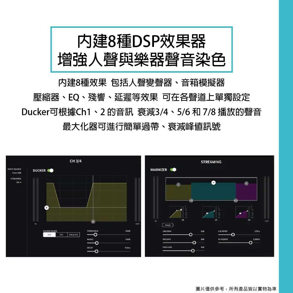 ◆ 內建8種DSP效果器,壓縮器、EQ、殘響、延遲等