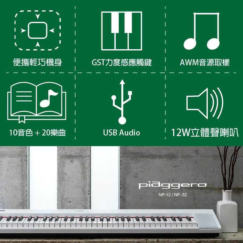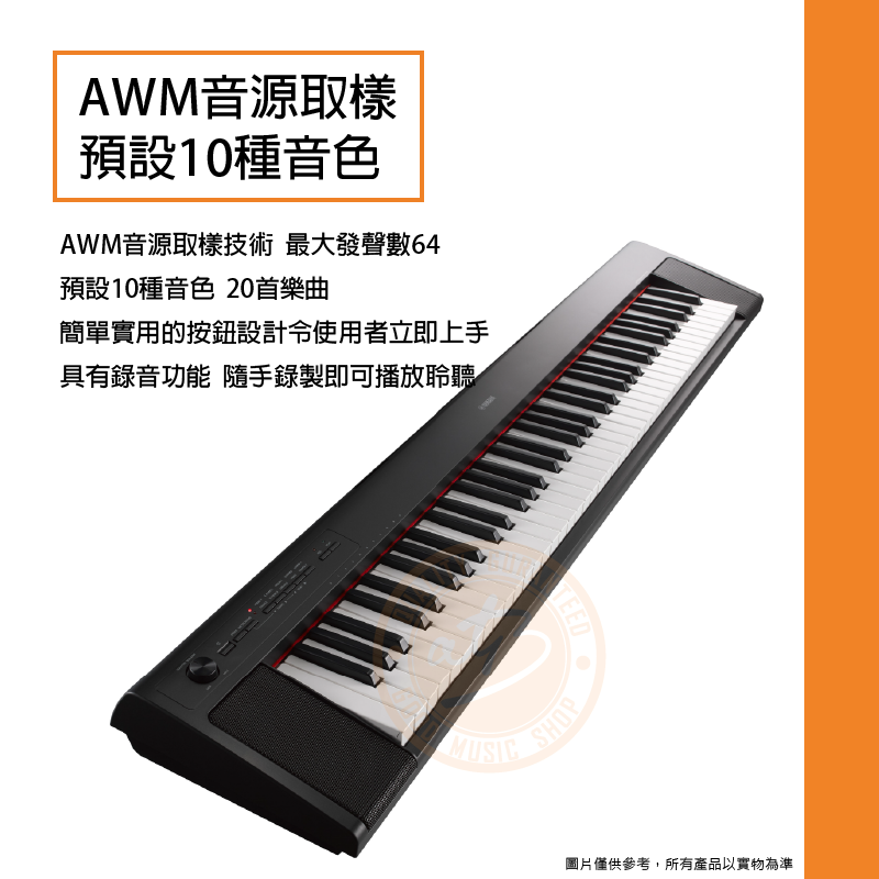 ◆ AWM音源取樣技術,預設10種音色,20首樂曲,簡單實用的按鈕設計令使用者立即上手