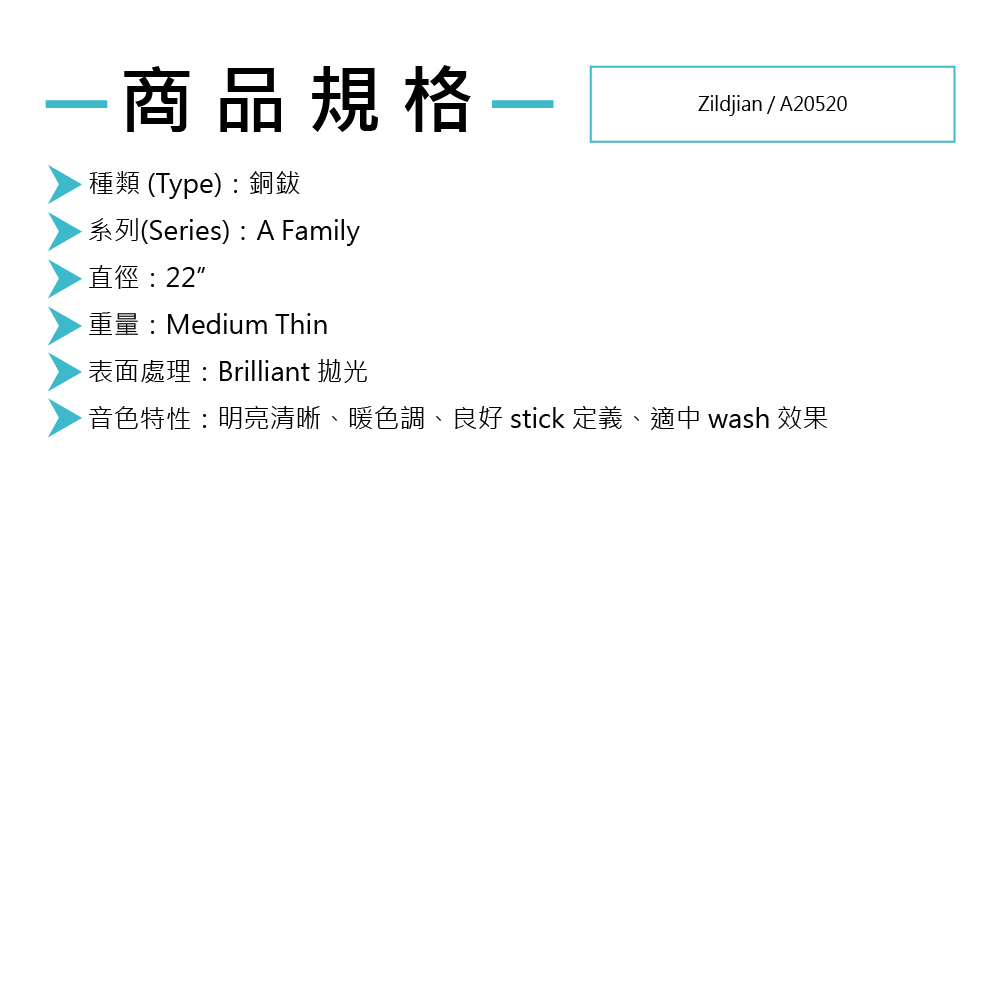 Zildjian / 22" A Custom Ride 銅鈸 (A20520)
