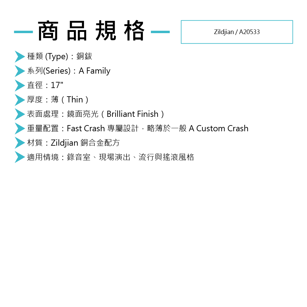 Zildjian / 17" A Custom Fast Crash 銅鈸 (A20533)