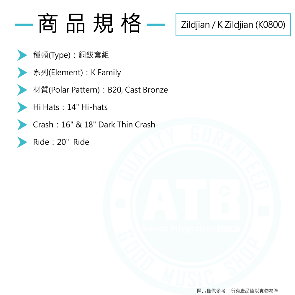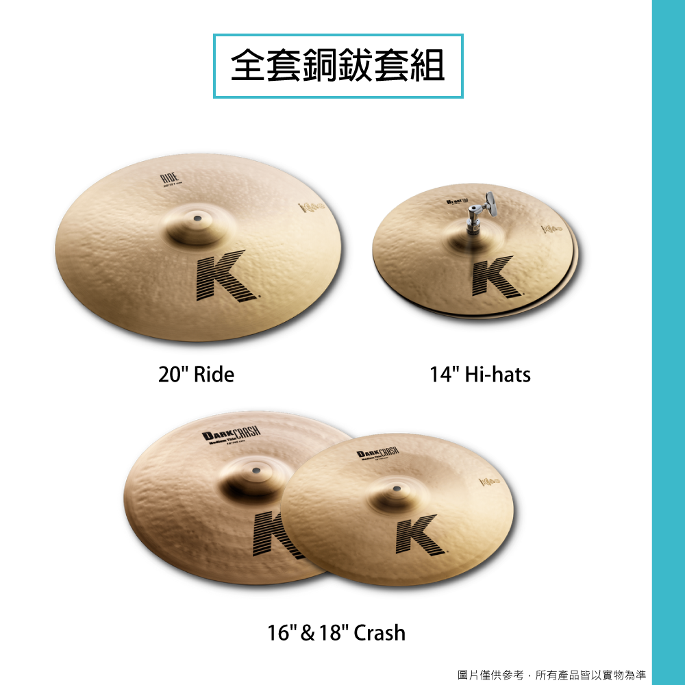 ◆ 內含14吋Hihats、16吋&18吋Crash Dark Thin、20吋Ride