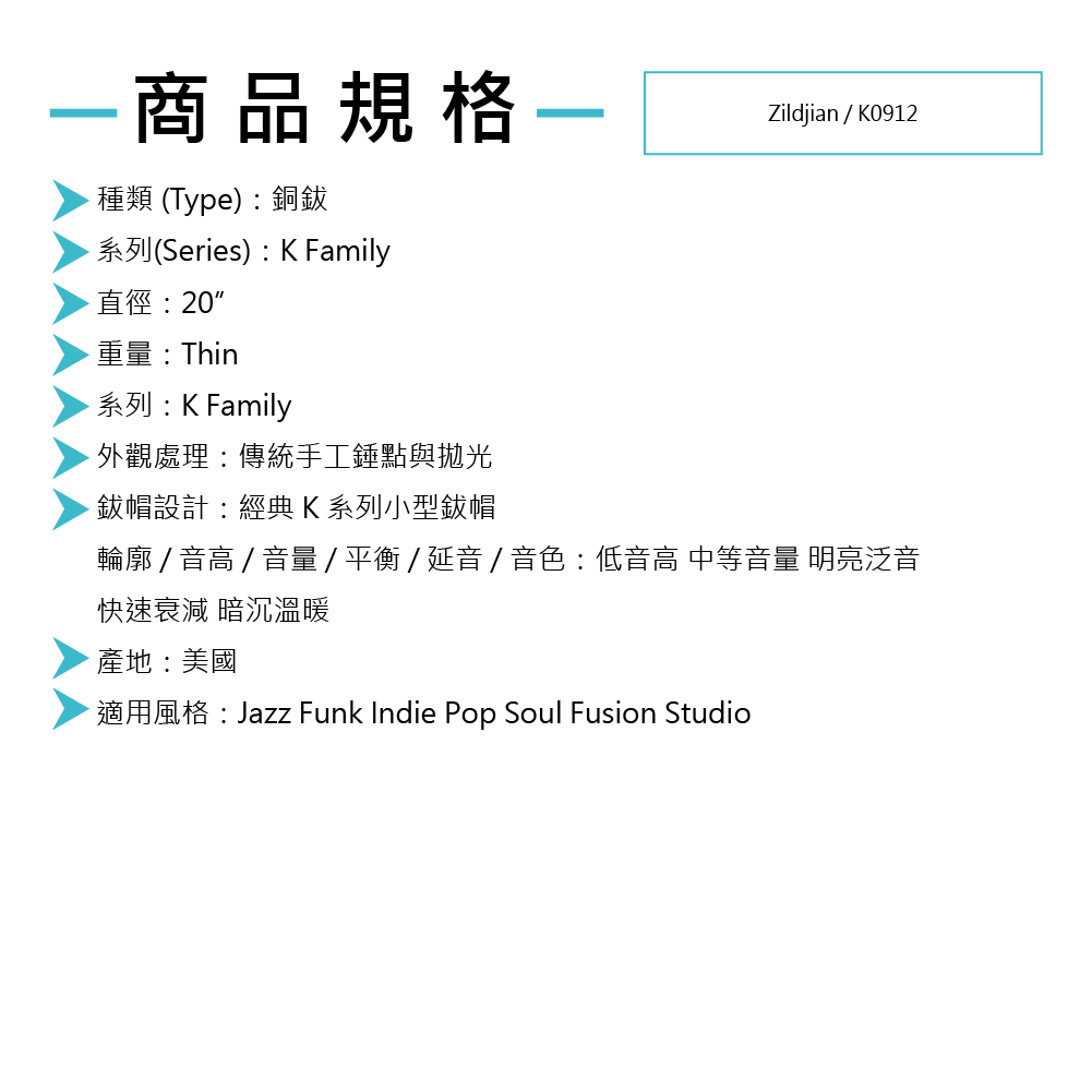 Zildjian / 20” K Dark Crash Thin 銅鈸 (K0912)