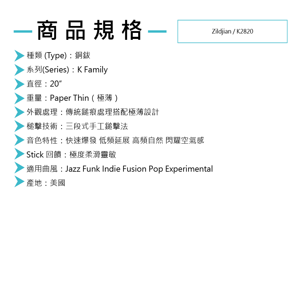 Zildjian / 20” K Paper Thin Crash 銅鈸 (K2820)