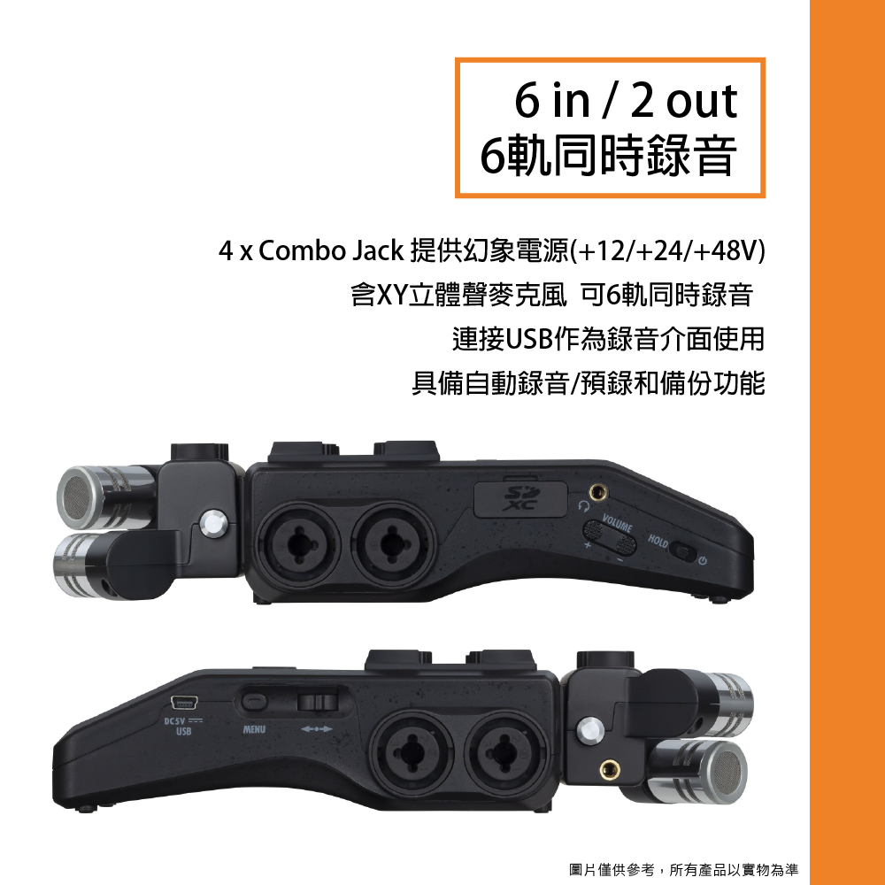 ◆ 4 x Combo Jack 提供幻象電源(+12/+24/+48V),含XY立體聲麥克風,可6軌同時錄音,連接USB作為錄音介面使用