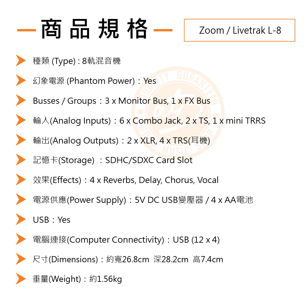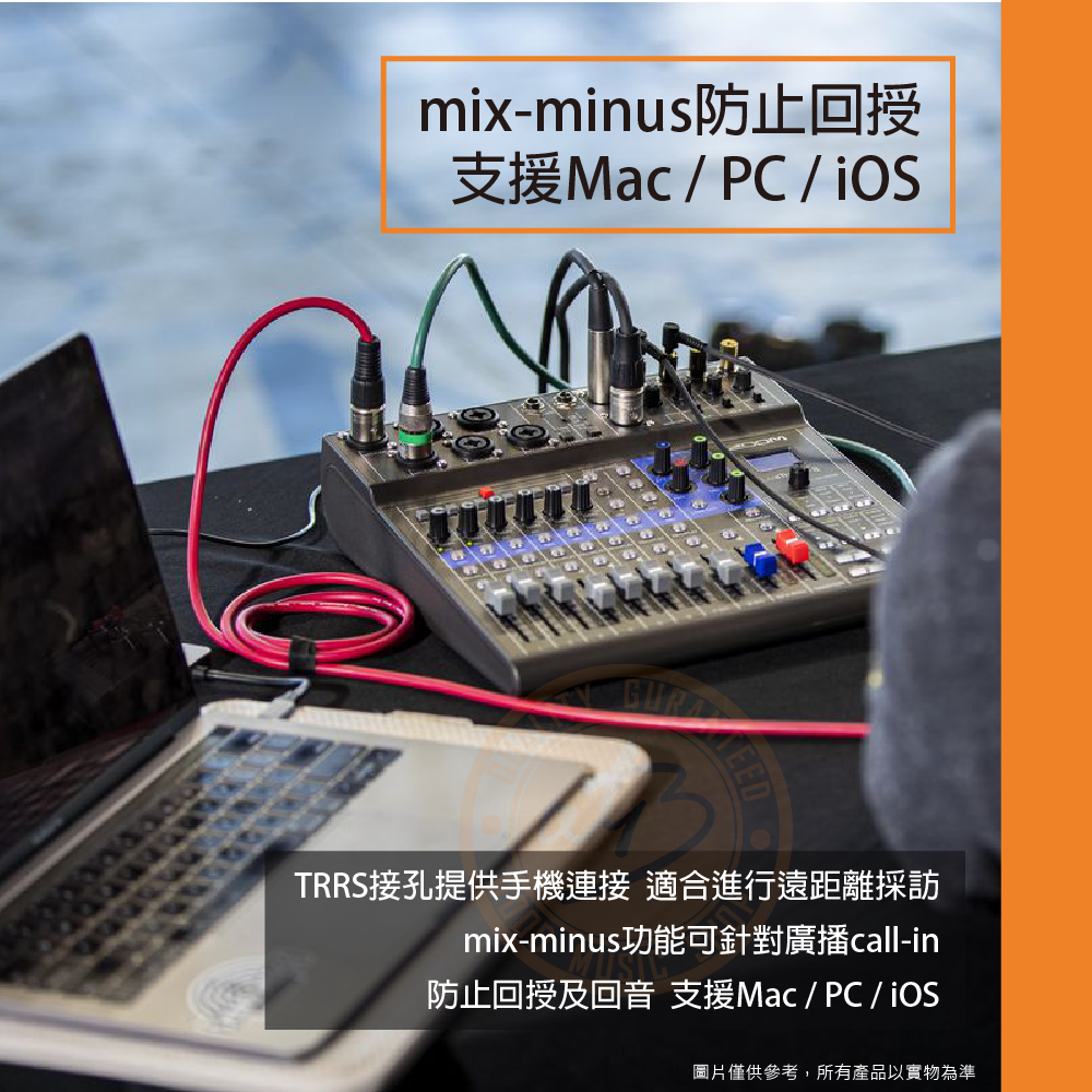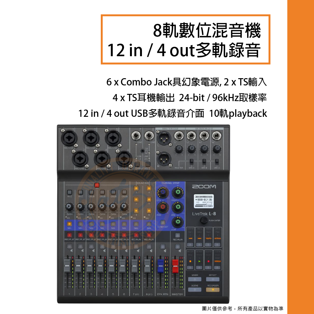 ◆ 8軌數位混音機,24-bit / 96kHz取樣率,具12in / 4out USB多軌錄音介面