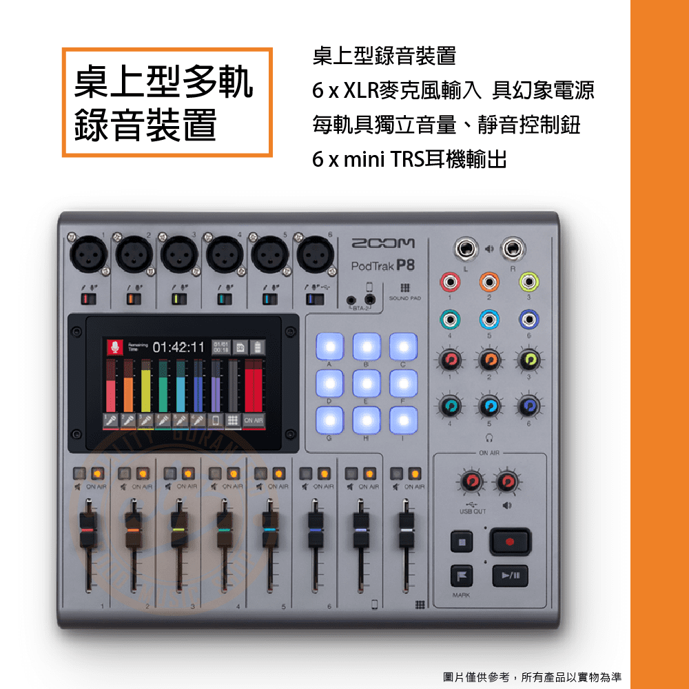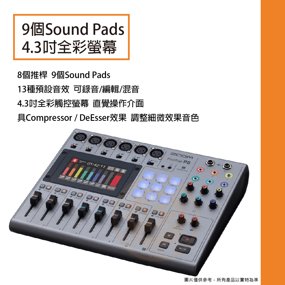 ◆ 8個推桿 9個Sound Pads,13種預設音效,可錄音/編輯/混音,4.3吋全彩觸控螢幕直覺操作介面