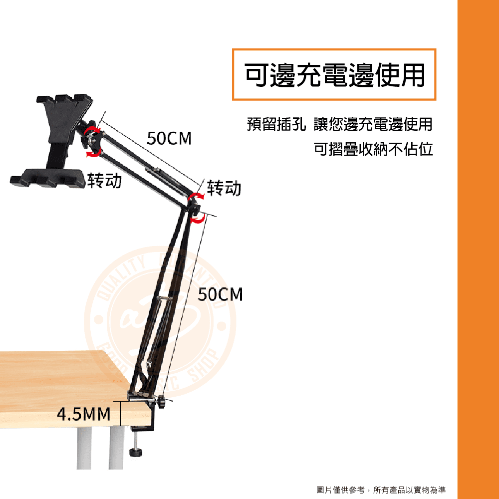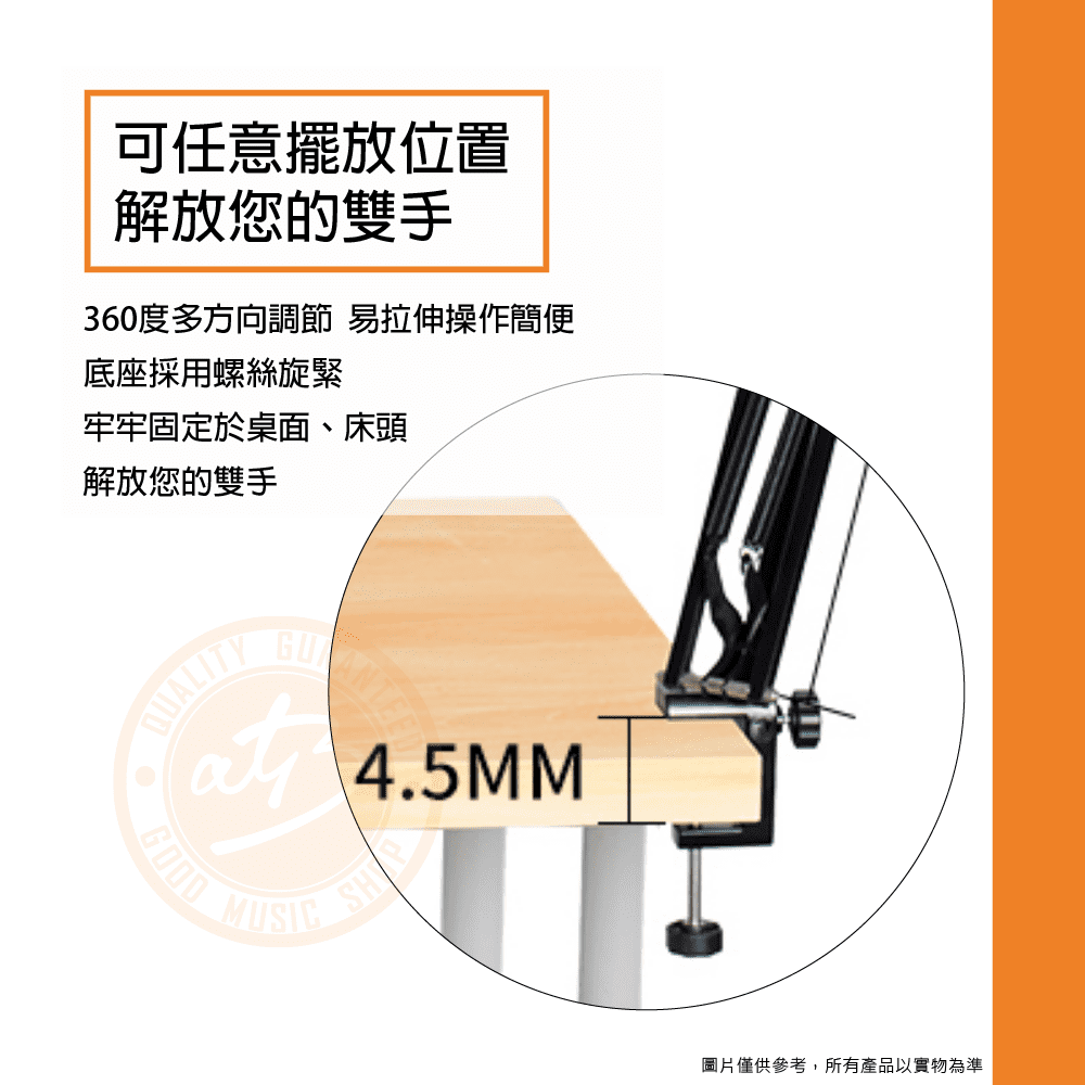 ◆ 360度多方向調節,易拉伸操作簡便,底座採用螺絲旋緊,牢牢固定於桌面、床頭